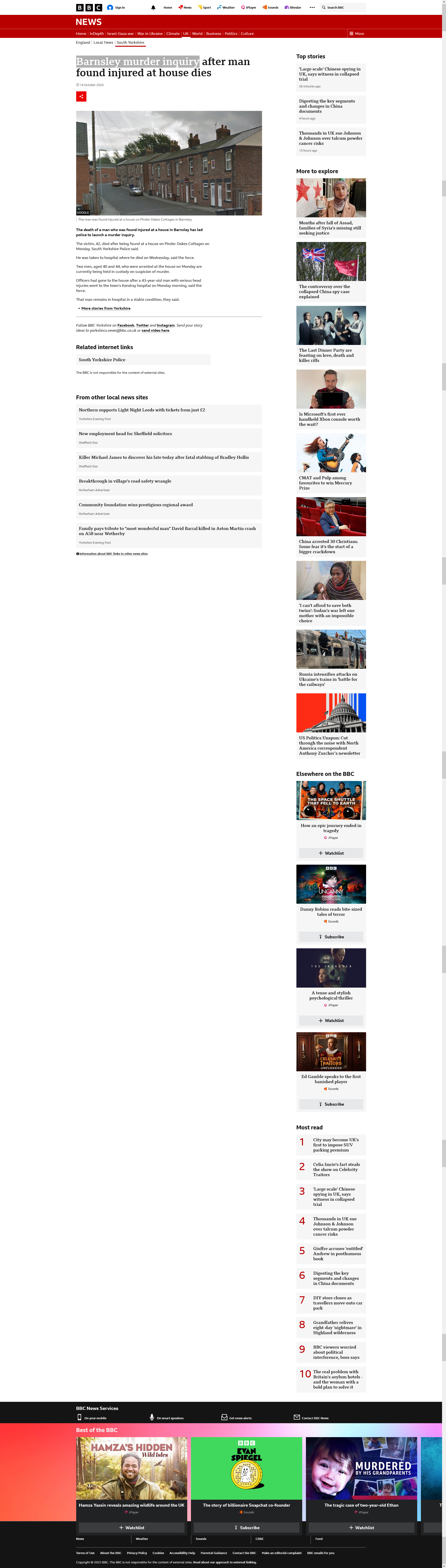 The victim, 42, died after being found at a house on Pinder Oakes Cottages on Monday, South Yorkshire Police said.