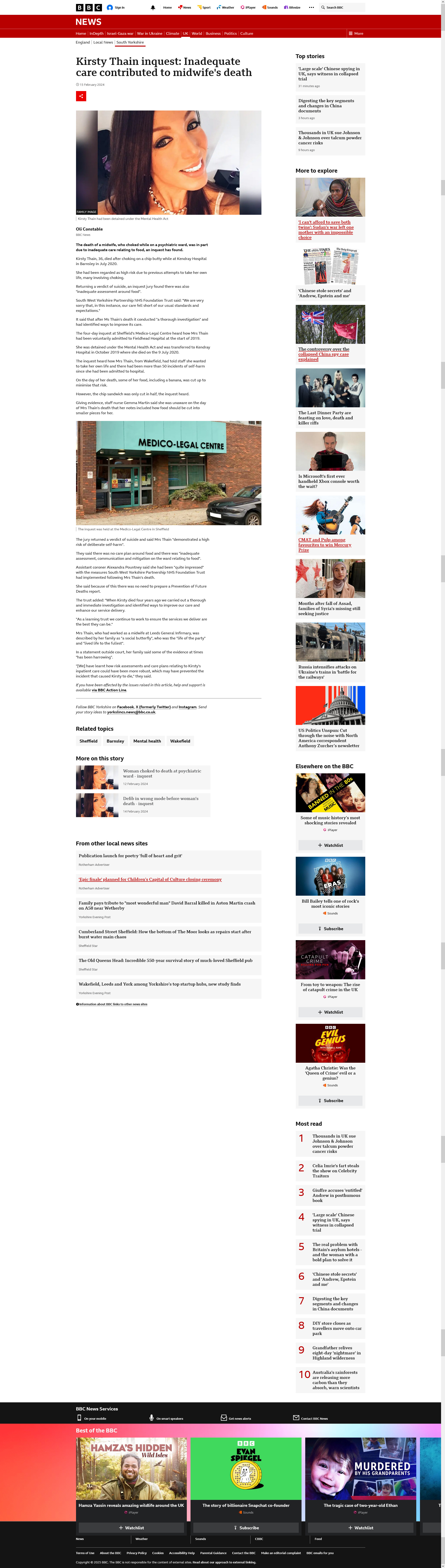 Kirsty Thain, 36, died after choking on a chip butty while at Kendray Hospital in Barnsley in July 2020.